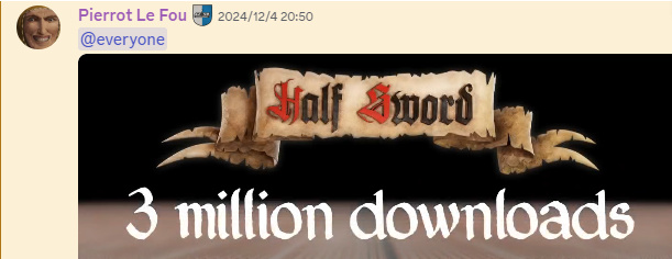 截止2024年12月4日,《Half Sword》的playtest和demo版本下載量已經超過了300萬,官方還爲此在DC上製作了視頻慶祝