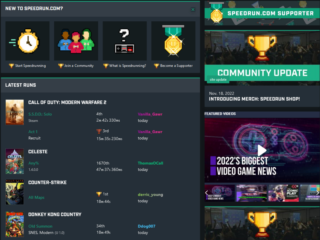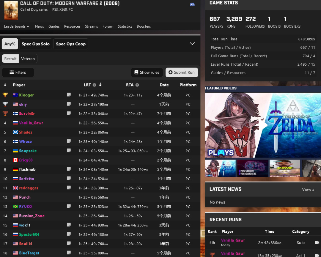 Metroid 2002、COMPET-N、Elite ranking……目前最被玩家熟知的莫过于Speedrun,这家成立于14年的后起之秀,仅用5年就成为了速通界的权威如今,权威排行榜网站Speedrun.com拥有 20,000 多场比赛的超过200万次速通记录。