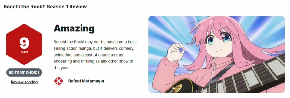 今日IGN爲動畫《孤獨搖滾》給出了9分的評分,評測者認爲本作可能不是基於暢銷動作漫畫改編的作品,但它貢獻給觀衆的,是無論在喜劇還是動畫,又或者其他類型節目中都是年度最佳的可愛優秀的角色陣容。 但是也有很多網友對這個評分有自己的看法,覺得IGN是否有點“手太長管的寬”呢?