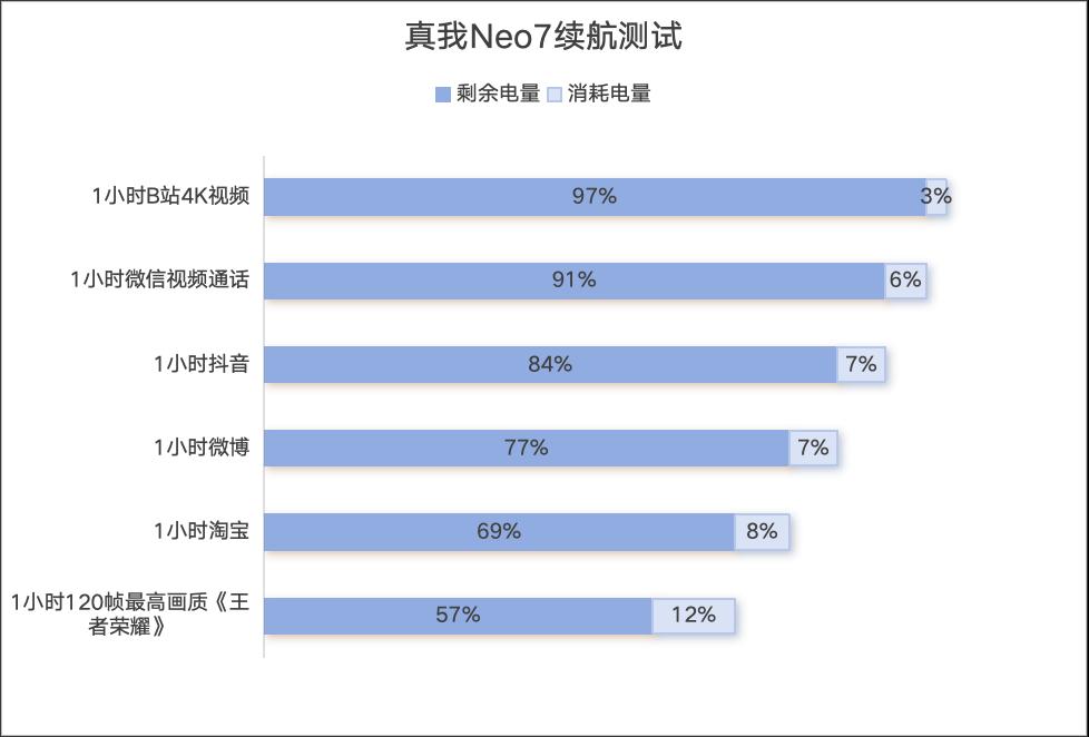 连续使用6小时后,手机最终剩余电量为57%。这样看来,真我Neo7日常使用1天肯定是没什么问题,甚至可以在不充电的情况下,连续使用两天。
