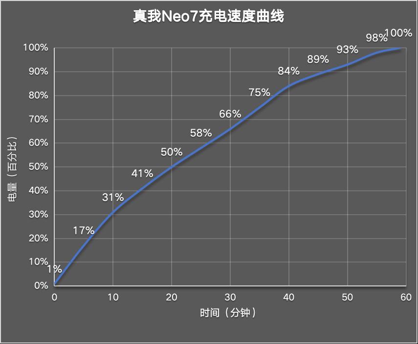 实测,手机电量剩余1%的状态下为其充电,5分钟充电17;10分钟充电31;15分钟充电41%;20分钟充电50%;25分钟充电58%;30分钟充电66%;35分钟充电75%;40分钟充电84%;45分钟充电89%;50分钟充电93%;55分钟充电98%,59分钟充至满电。