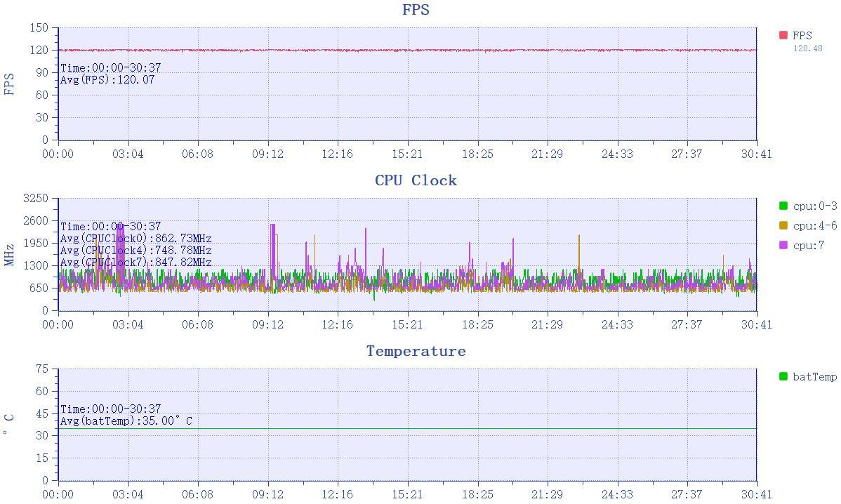 最高画质120帧《王者荣耀》,游玩30分钟5V5排位赛,不管是清扫兵线,还是打团战,画面帧数表现都非常稳定,平均帧率为120.07 FPS。