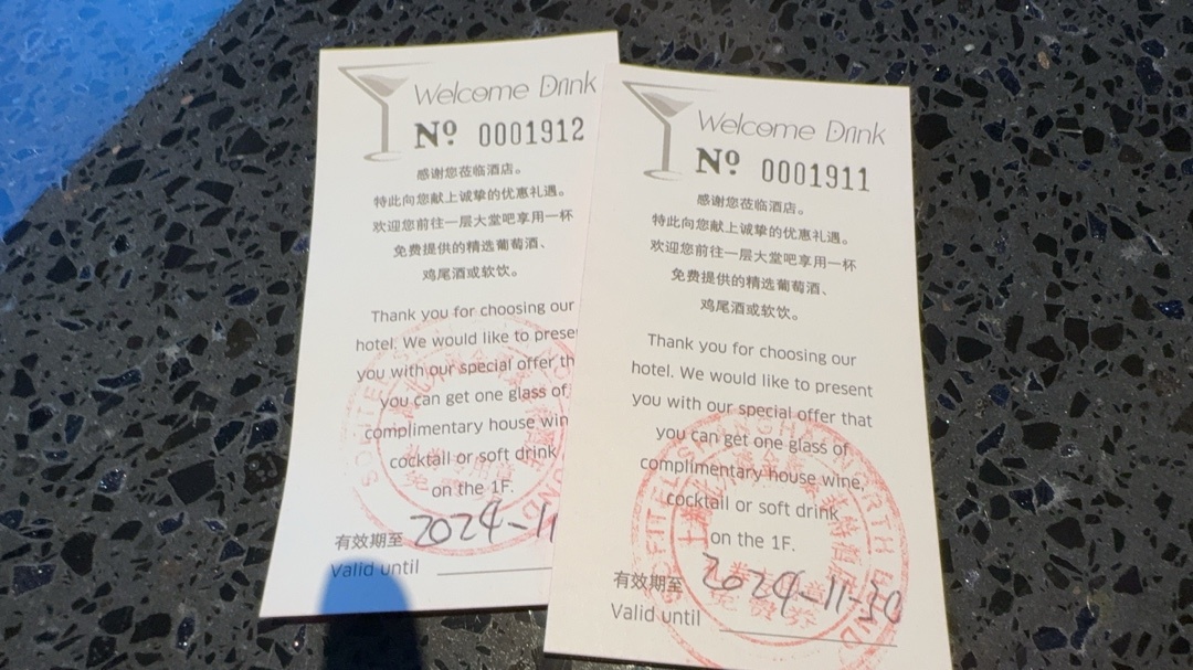 会员礼遇:用雅高升房券升的房(这家金卡一级都没升),免费双早,两张饮品券(可以在大堂吧换两杯酒水,有葡萄酒、啤酒和鸡尾酒)
