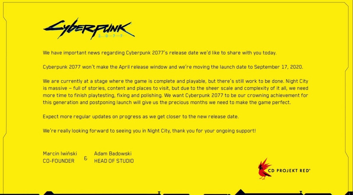 “我從來沒有見過任何一款遊戲受到如此程度的炒作。”格拉博斯基承認。2019年E3結束大約6個月後,公司宣佈了《賽博朋克2077》首次跳票,發售日期由2020年4月6日延期至9月17日。隨着時間推移,媒體和玩家對遊戲的巨大熱情導致CDPR公關團隊不堪重負。“我和我的團隊不得不處理收到的大量問詢、採訪、封面故事等,這些都意味着額外的工作量。”