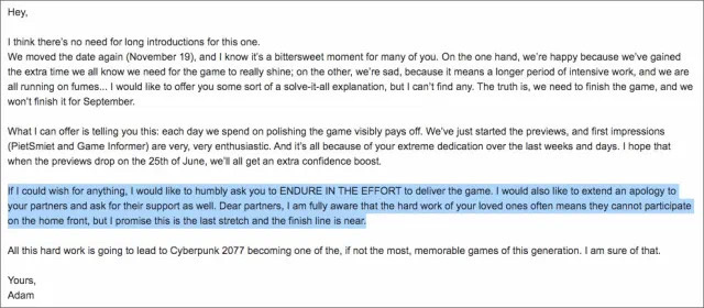 許多玩家想知道,既然CDPR對《賽博朋克2077》的質量還不完全滿意,爲什麼不將發售日期繼續推遲?首先,正如諾瓦克沃斯基所說,公司內部溝通不暢和過度自信,使得決策者認爲不需要這麼做。其次,《賽博朋克2077》團隊在當時太疲憊了。