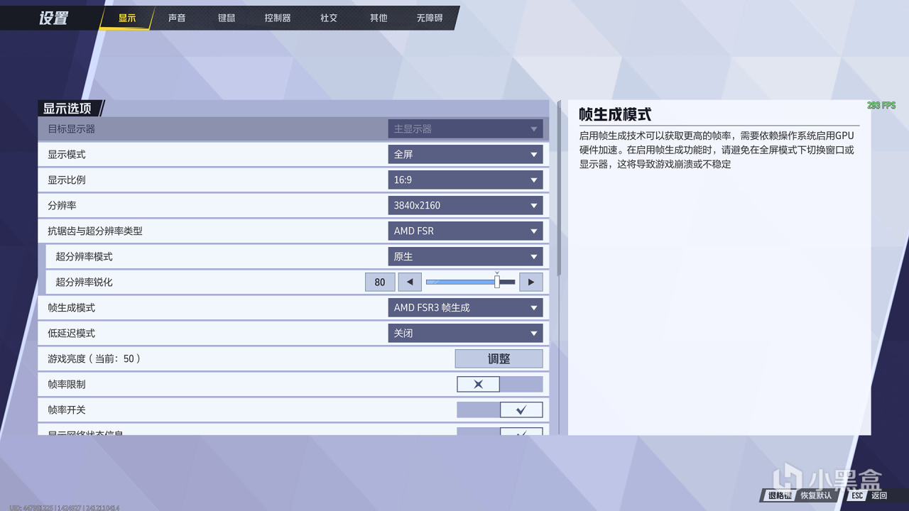 4K无脑拉满,TAAU抗锯齿之下就连旗舰级的XTX也未能达标,要知道这可是一款漫风竞技网游呢!通过FSR补偿性能的方案呢,流畅门槛也不低,也至少需要RX 7900 XT,至于补帧这种设置个人是不推荐的,非要补建议原始帧也要60fps以上。