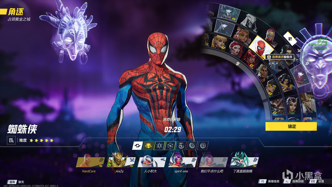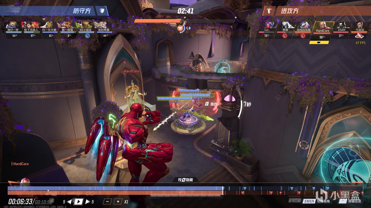 测试场景方面,《漫威先锋》和OW2一样也是内置战局回放系统的,UI风格还多少有点相似,硬核是直接挑了一局快速模式-融合(贾利亚神殿)作为基准测试,主视角是钢铁侠,期间会触发几次团战,符合游戏日常强度,时长一分钟左右,足够有参考价值。
