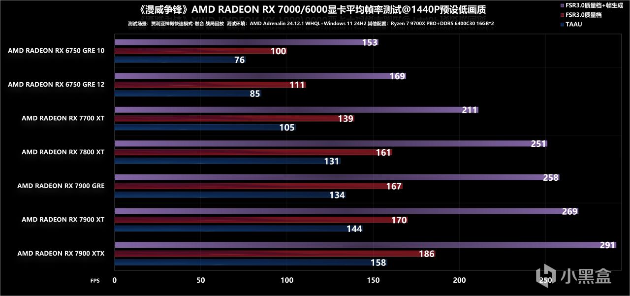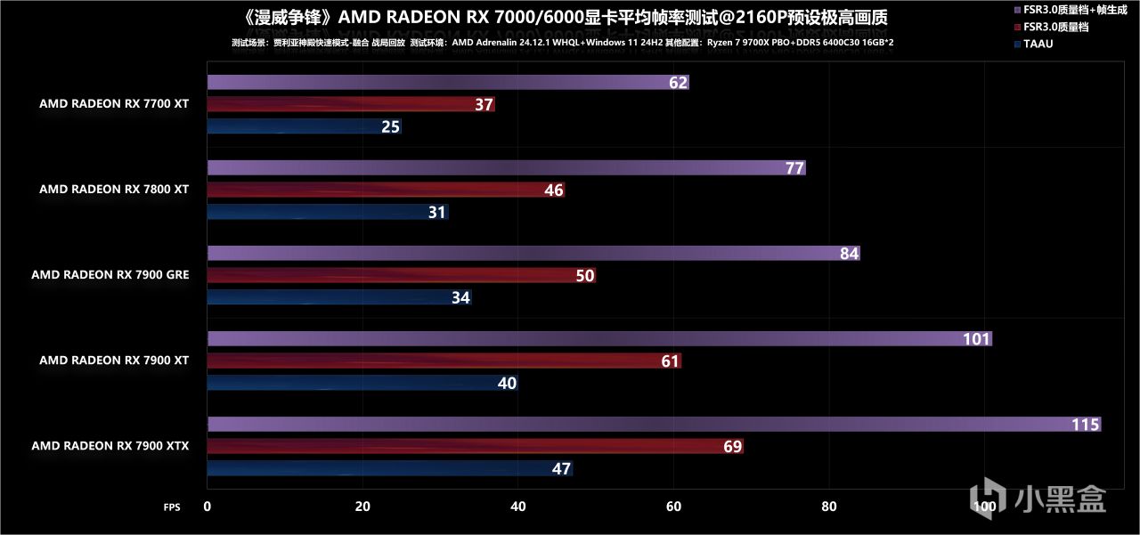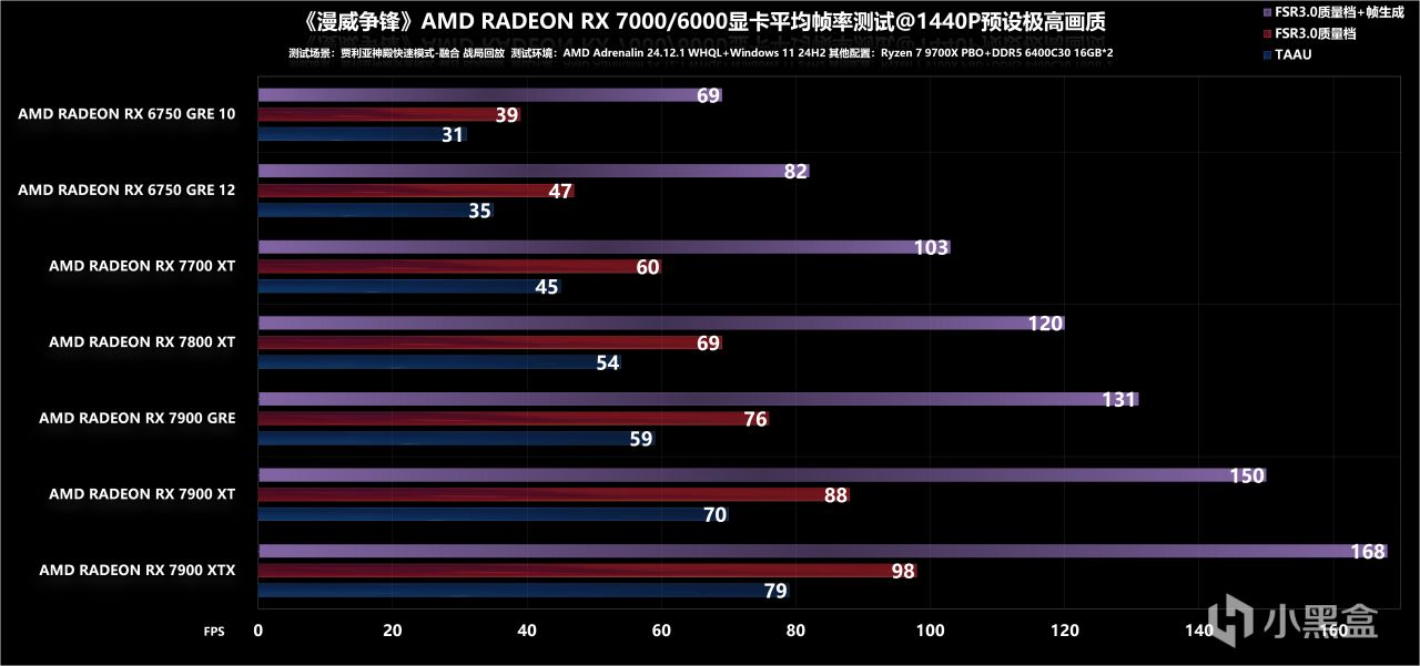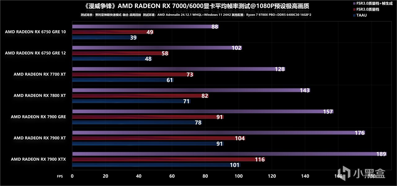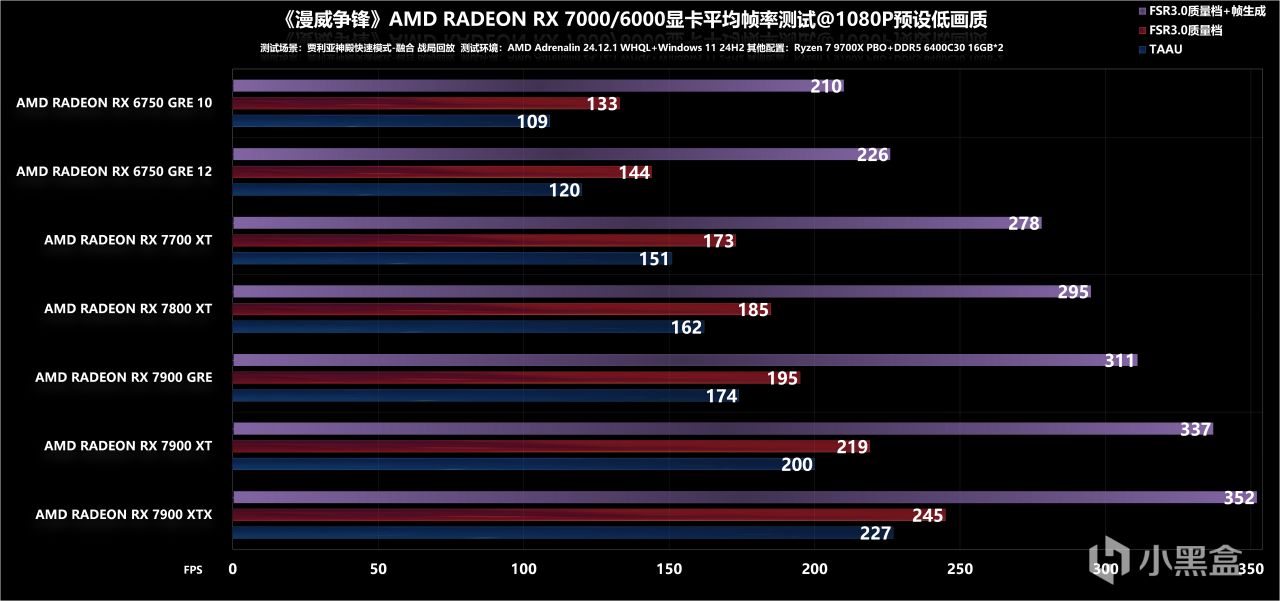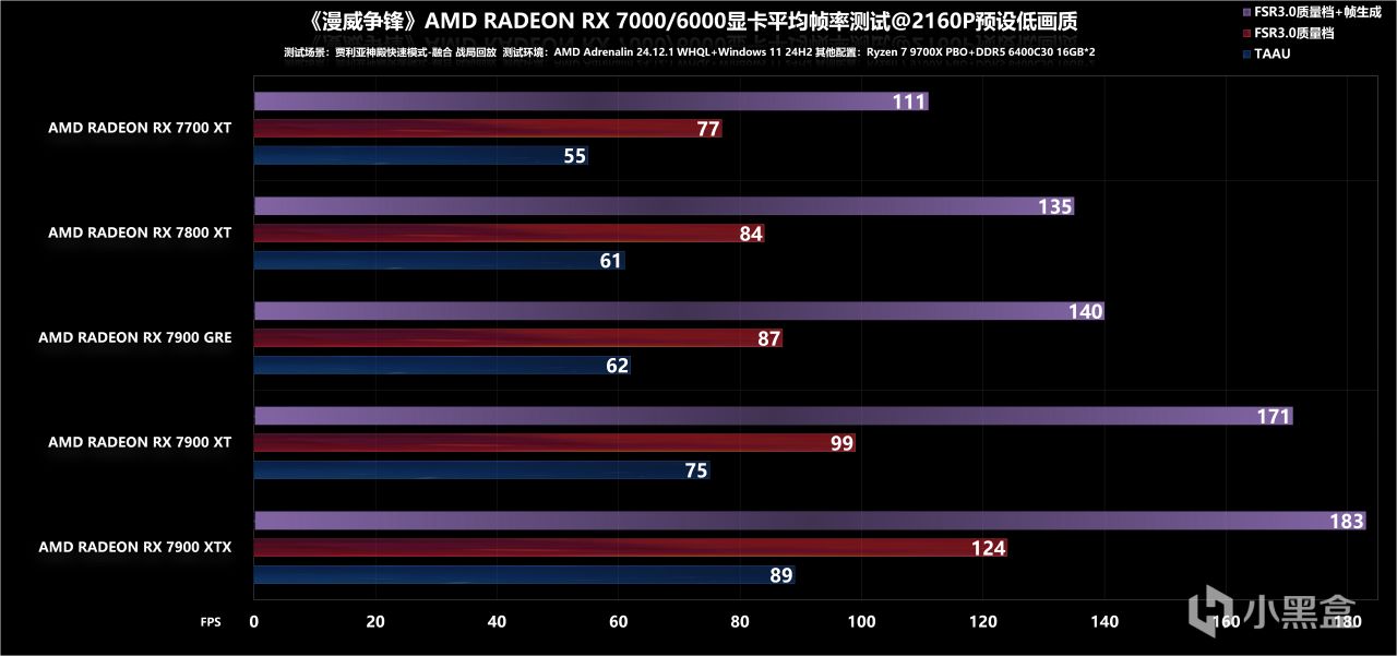 最后是4K分辨率调低,可以看到仅需要RX 7800 XT就能通过60fps大关,FSR+补帧的方式效果同样不错,能满足最基础的高刷需求,至于更高一阶的高刷方案,反正个人是推荐RX 7900 XT起步了。