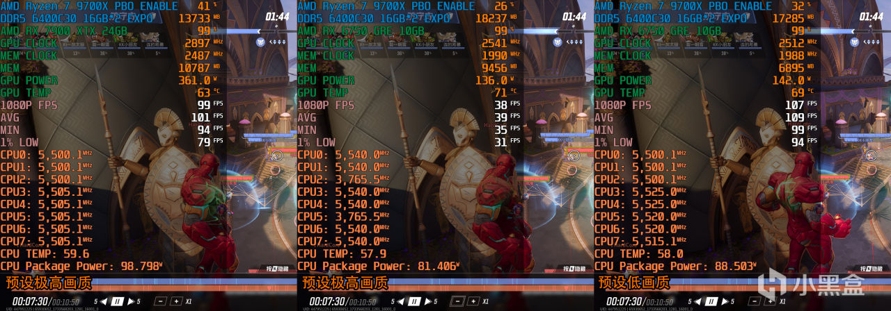 最后,推过三种1080P分辨率设置下OSD监测可以发现,首先9700X已经能完美满足XTX显卡的需求,GPU占用率达到99%,CPU性能需要不会特别高,测试全程GPU占用基本都能跑到90%以上。