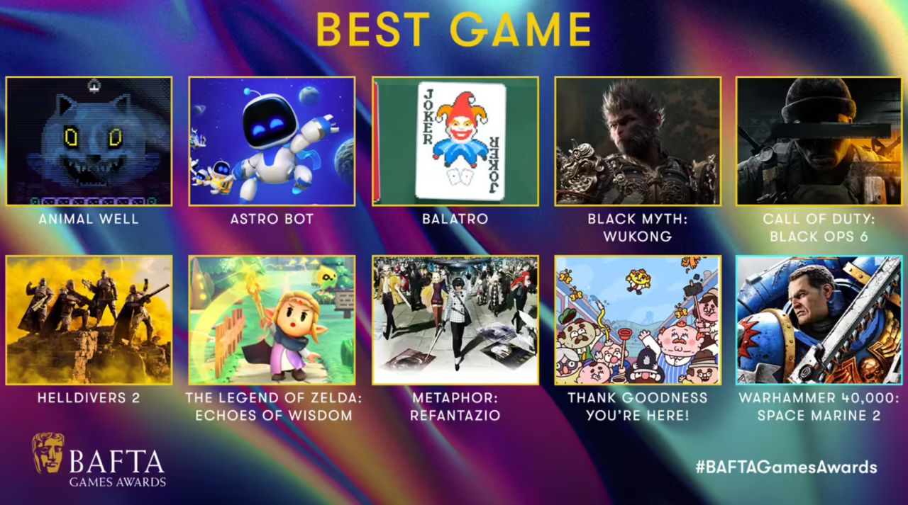 與《黑神話:悟空》一同角逐 BAFTA 年度最佳遊戲獎的作品,還包括《動物井》《宇宙機器人》《小丑牌》《使命召喚:黑色行動 6》《絕地潛兵 2》《塞爾達傳說:智慧的再現》《暗喻幻想:ReFantazio》《謝天謝地你來了》以及《戰錘 40K:星際戰士 2》。