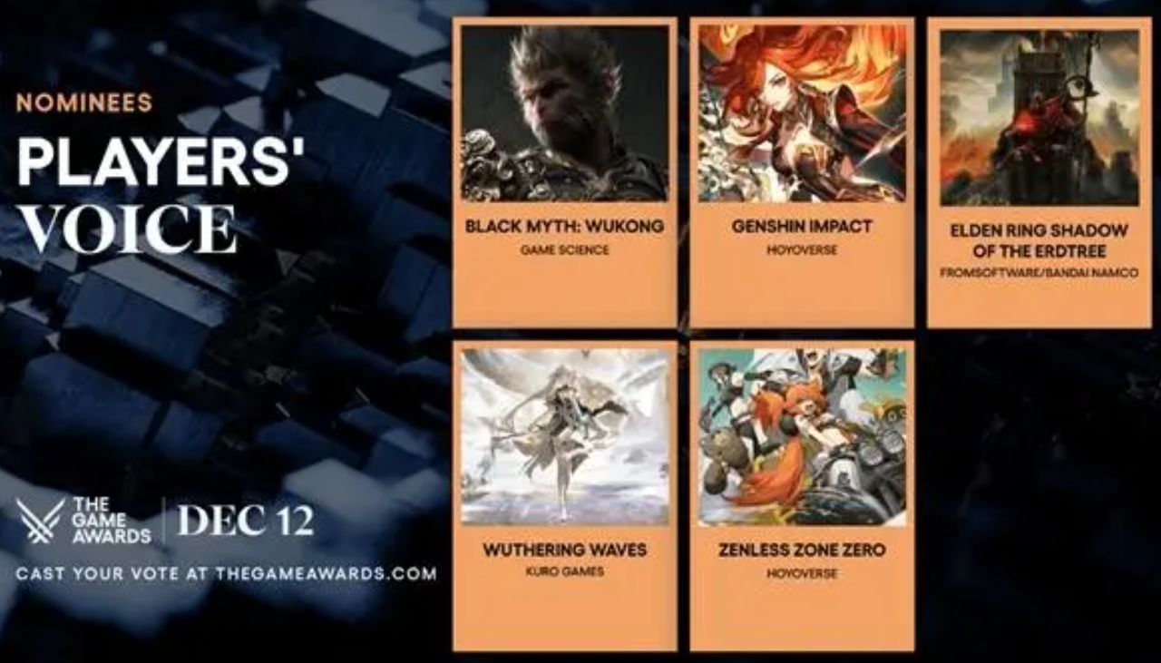 據媒體報道,TGA玩家之聲第三輪投票已於今天上午10點截止,入圍最終輪的有《黑神話:悟空》《原神》《艾爾登法環:黃金樹幽影》《鳴潮》《絕區零》。