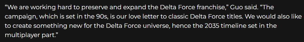 在回答另一个问题时, Shadow Guo 谈到了战役设定和主题背后的灵感,他表示《三角洲行动》的很多元素都在向过去的《三角洲特种部队》游戏致敬!