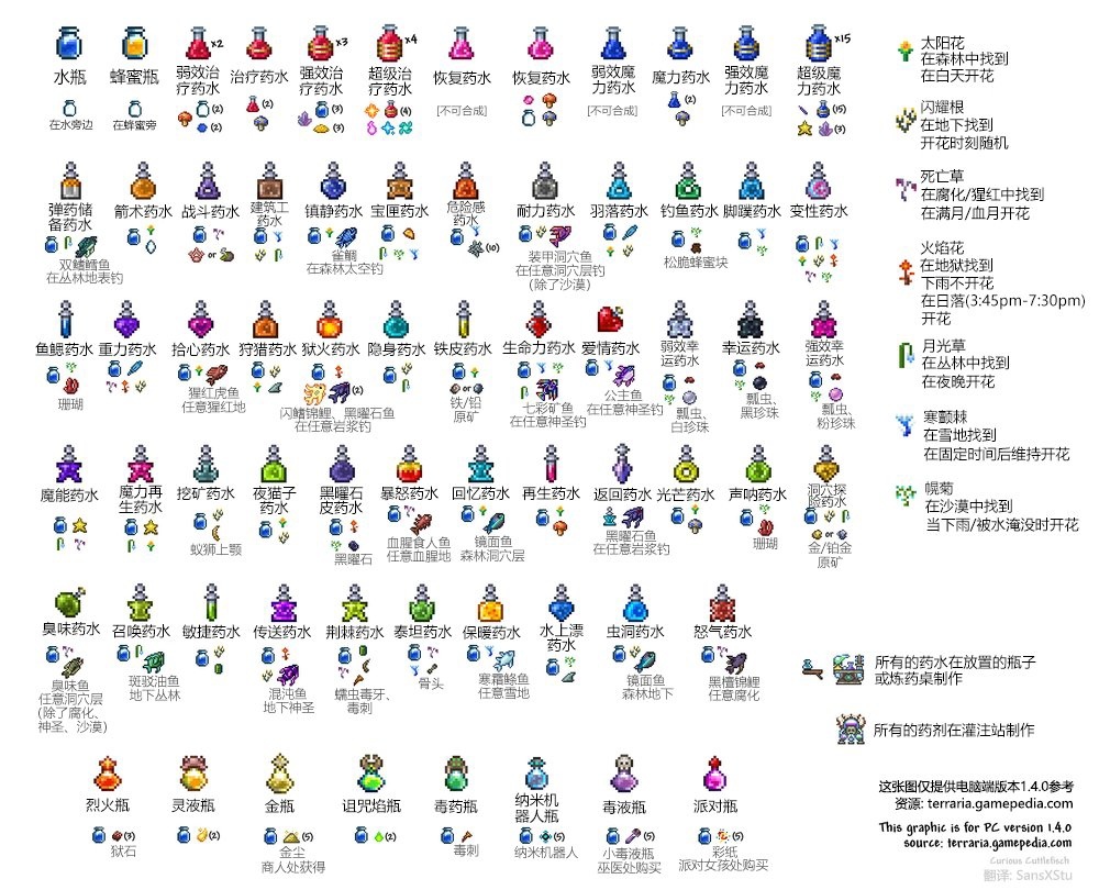 重力药水(鸟妖羽毛,闪耀根,死亡草,火焰花):前期在宝箱中可以开出,使用后可以按↑键颠倒上下,熟练使用的话两三瓶就可以在前期探索完整个地图的空岛,但是使用时持续下坠也会受到坠落伤害。