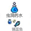 虫洞药水(闪耀根):联机非——常好用的药水,在游戏中打开背包,饰品栏左上角有六个颜色的按钮,玩家点击相同颜色视为队友,打开地图点击队友头像,自动使用虫洞传送。只能在多人游戏模式下打碎罐子或者史莱姆掉落,不需要其他玩家一定在线,多人即可,在单人模式下也可以制作。