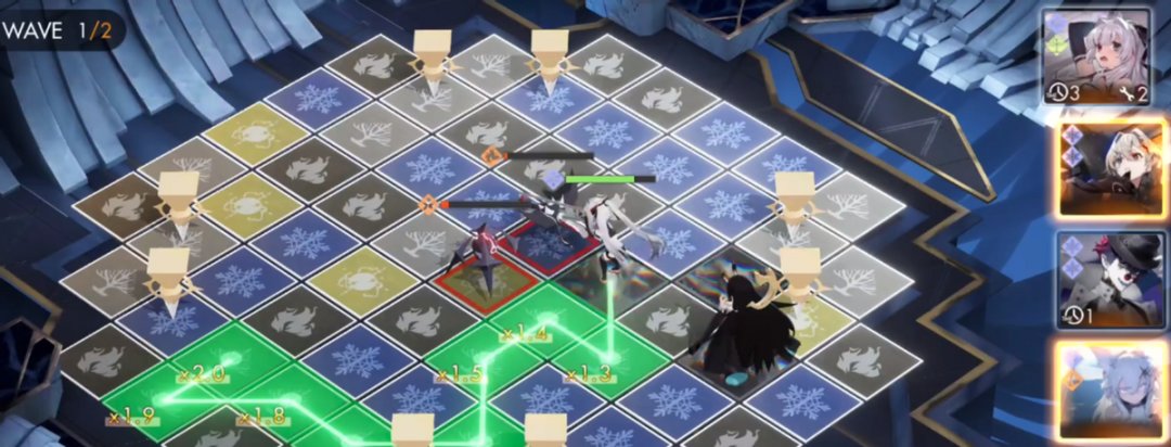 而一般向的二遊就必須得靠着玩法來撐着,結果《白夜極光》的玩法是走格子+一筆畫+消消樂,屬於是把戰棋和消消樂縫在了一起,棋盤會隨機給不同顏色,角色和敵人分別佔據不同的顏色格子,相鄰的相同顏色可以連接,角色會沿着連線走到終點,攻擊線路周圍的敵人,然後被連起來的格子會重新隨機生成顏色。