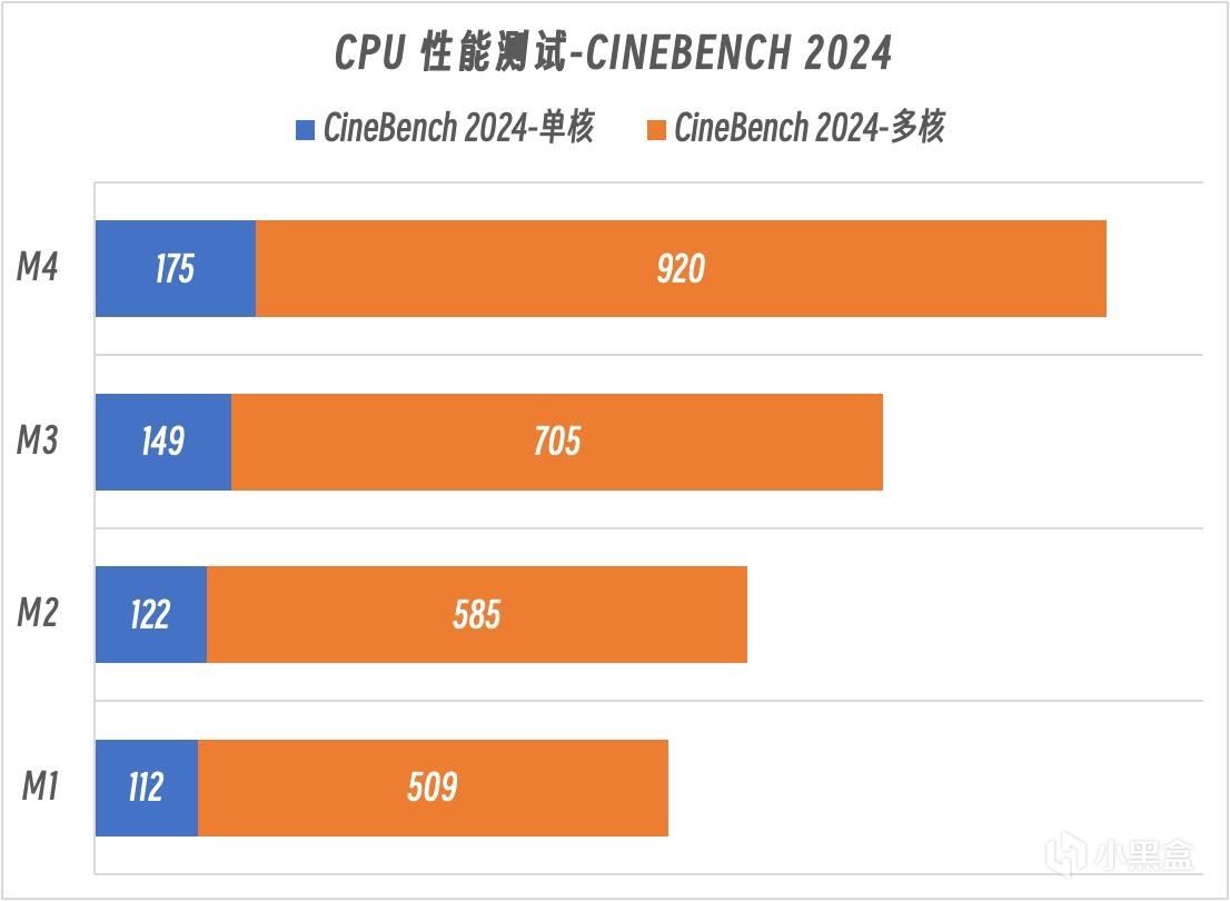 在 CINEBENCH 2024 測試中,M4 的單核性能爲 172pts,多核性能 920pts。