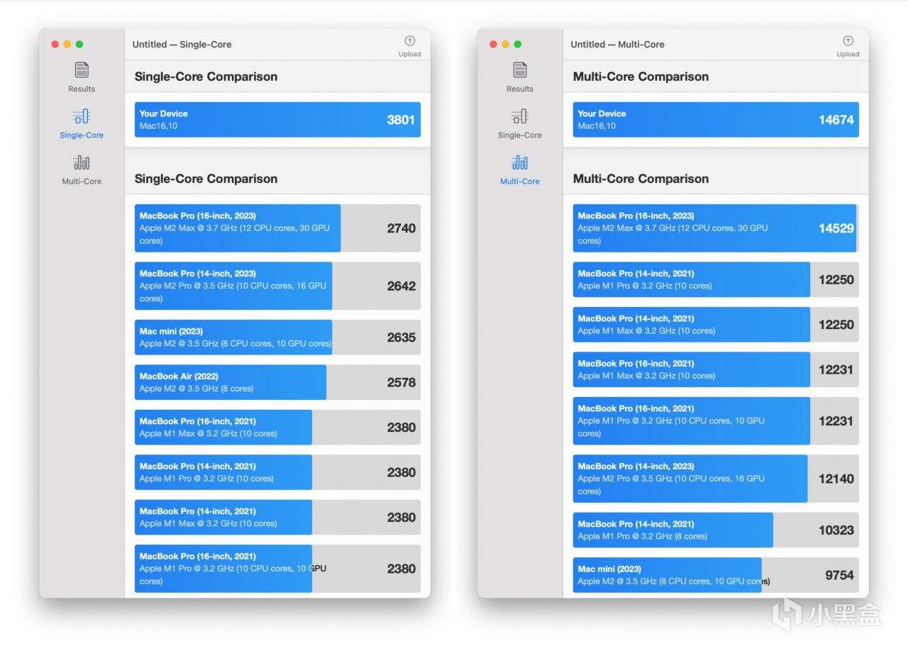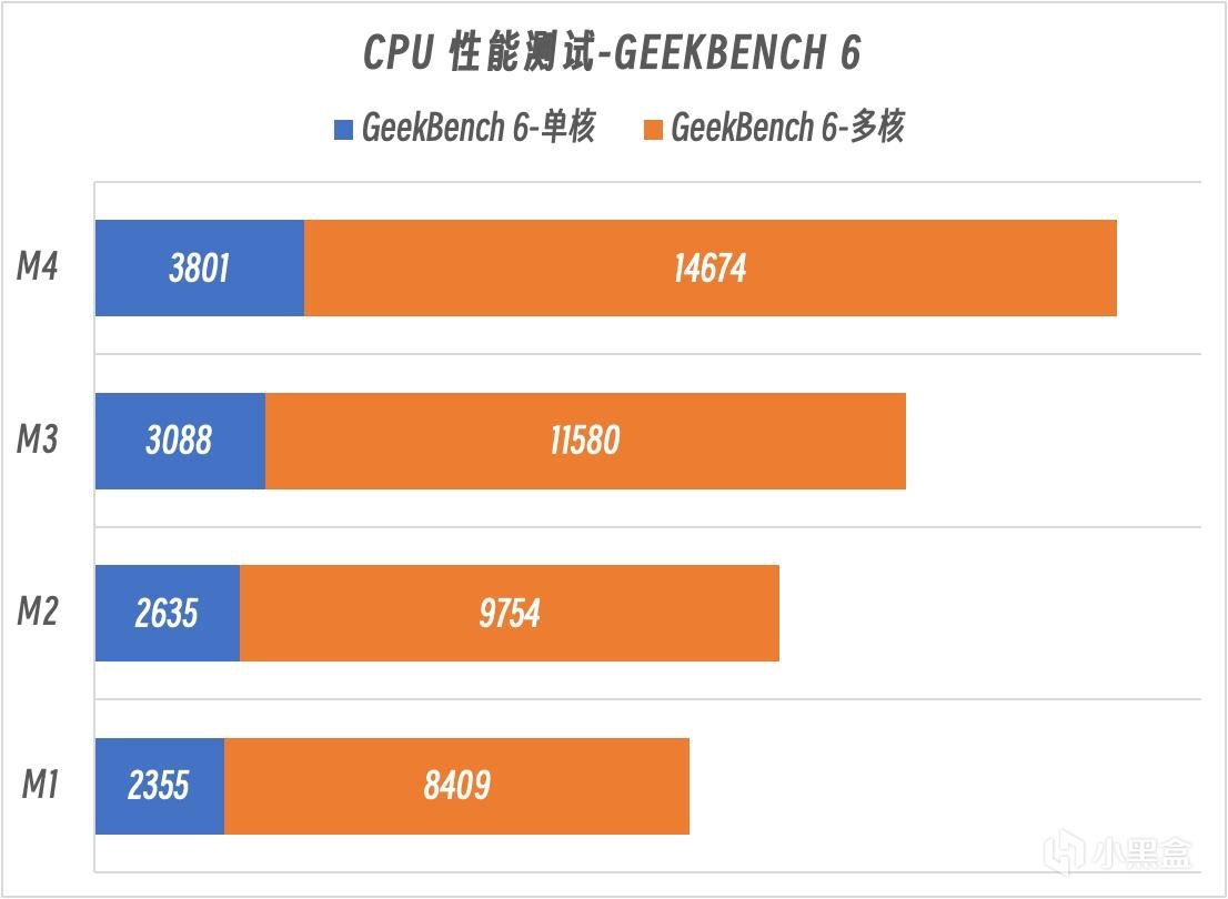 然後我就抓緊給 M4 跑了一個分,一跑真的嚇一跳。GeekBench 6 單核性能 3801 分,大幅領先於前幾代產品,哪怕是前代最強的 M3 Max(2900-3200 分),也無法與之抗衡。而多核性能達到了 14674 分也非常接近 M2 Max(14600-14800 分)。