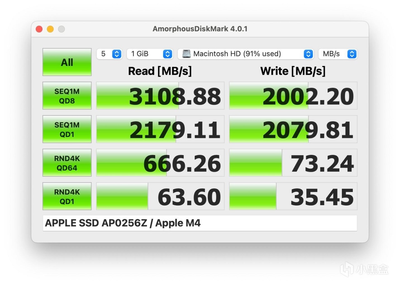 那麼致態靈·先鋒版移動固態硬盤的表現如何呢?我們測測速就知道了。先來看看本地硬盤的性能表現,通過 macOS 端的 AmorphousDiskMark 測試。本地硬盤順序讀速達到了 3108.88MB/s,順序寫速 2002.20MB/s,隨機讀速達到了 666.26MB/s,隨機寫速達到了 73.24MB/s。