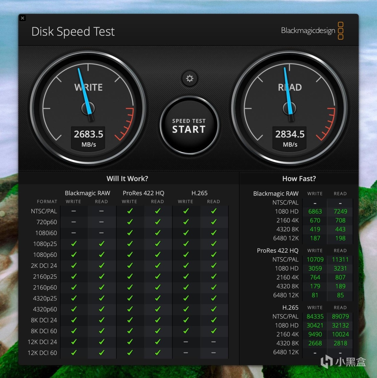 在 macOS 平臺的 Disk Speed Test 測試中,順序寫入速率達到了 2683.5MB/s、順序讀取速率達到了 2834.5MB/s,如果是 512GB 硬盤版本,以上的讀寫性能都能達到 3500MB/s,代價就是要 + 1500 元。