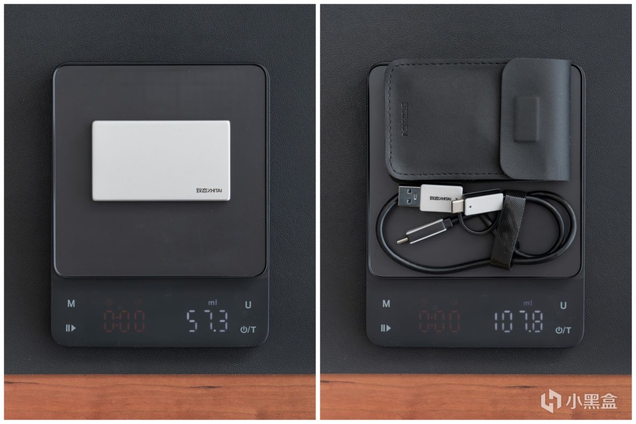 其次,PSSD 的重量和尺寸控制也是相當優異,實測 57g 左右,加上數據線和收納包接近 108g。相比之下,常規的 2TB 移動機械硬盤不算上配件,重量都有 150-200g。