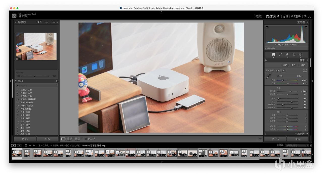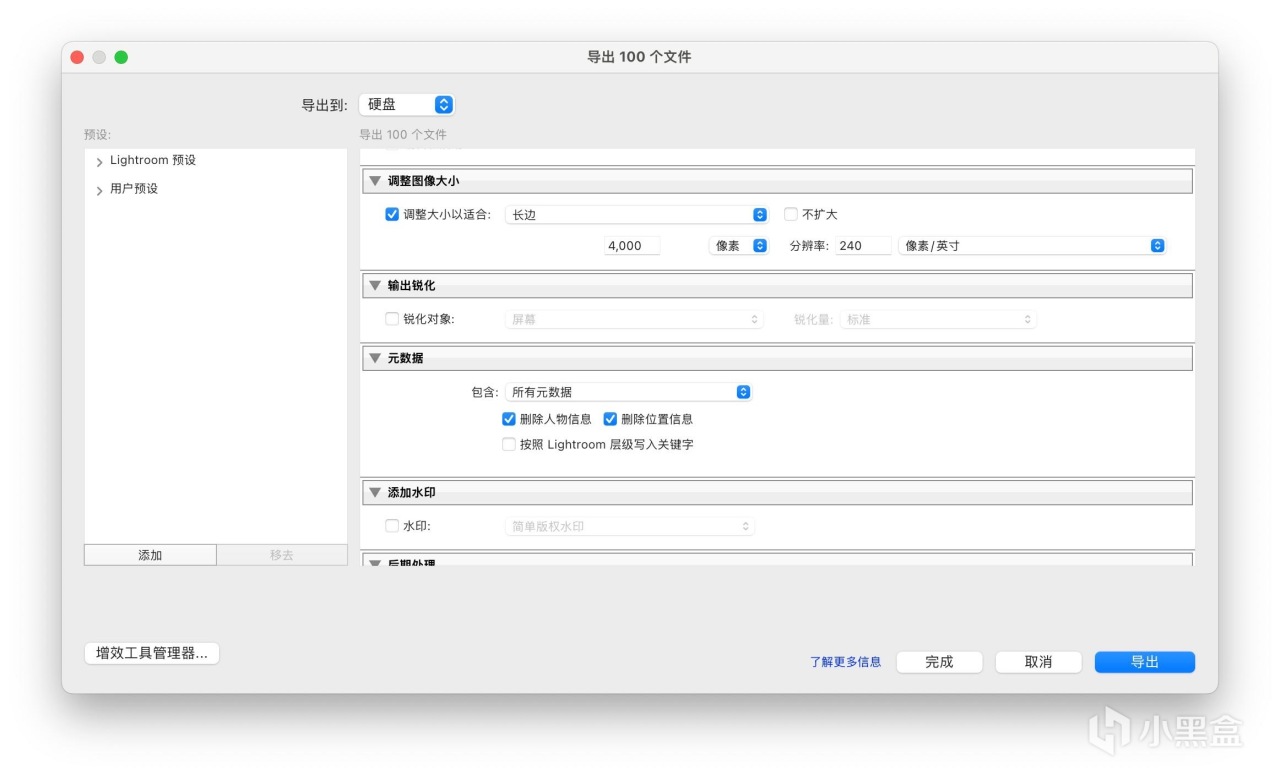 首先,我們在圖片批處理軟件【Adobe Lightroom】 中導入 100 張 A7R4 拍攝的 RAW 格式樣張,每張照片採用標準流程進行校色並同步,素材、導出均位於該硬盤區域內。按照長邊 4000 像素,容量<4000KB 導出成片。