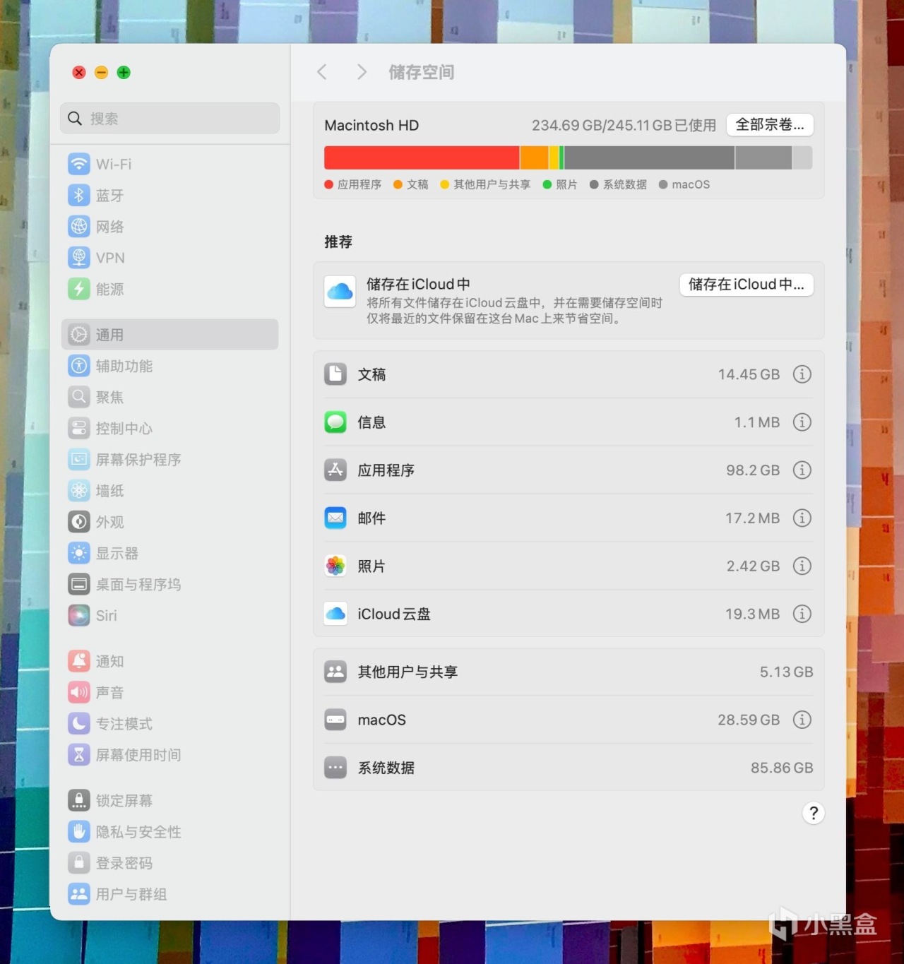 雖然 Macmini 的 M4 芯片強無敵,不過它的硬盤空間就沒有那麼驚豔了。等我部署完環境,下載好常用的軟件後打開存儲空間一看,好傢伙,竟然只剩下 10GB 左右的餘量,因爲本身 256GB 空間就僅有 245.11GB 可用,系統數據 + macOS 就分走了 47%(114.45GB),剩下的空間再裝點 Adobe 全家桶、達芬奇等軟件,空間基本上就所剩無幾了。