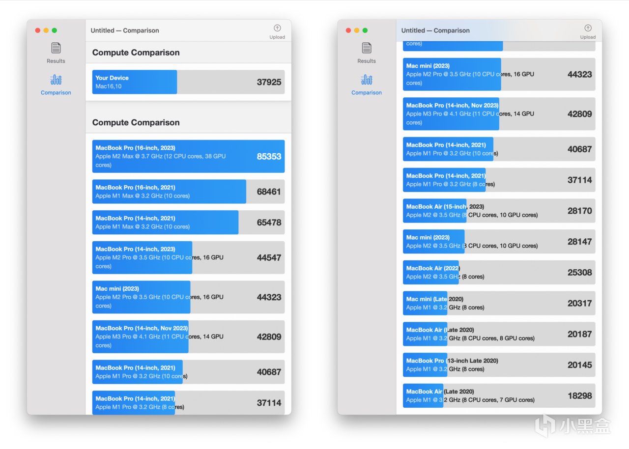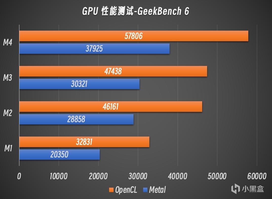 在 GPU 性能方面,GeekBench 6 得分爲 37925 分。相比於 CPU 性能的高歌猛進,M4 的 GPU 得分就要遜色於 Pro 和 Max 家族不少,得分介於 10 核心 與 8 核心 的 M1 Pro 之間。