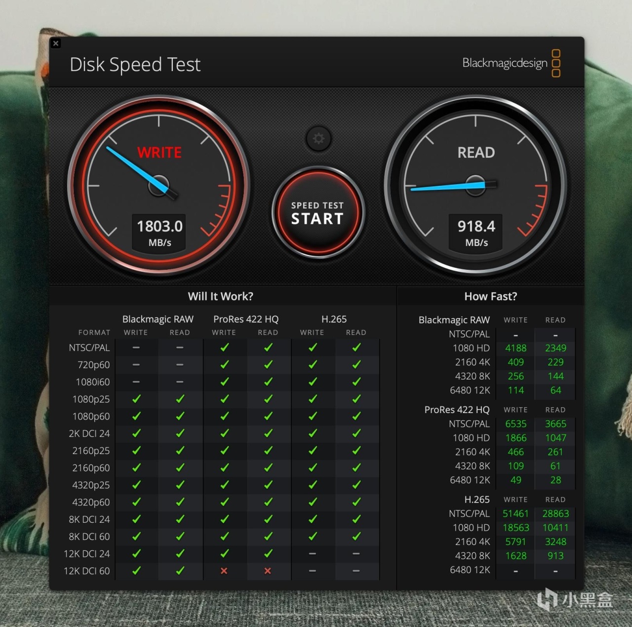 接下來就是致態靈·先鋒版移動固態硬盤的性能數據,在 Disk Speed Test 測試中,順序寫入速率達到了 1803.0MB/s、順序讀取速率達到了 918.4MB/s。同時在下方的性能對照表中,可以看到 12K/24fps 以下的素材都是可以讀寫的,12K/60fps 讀取也是可行的。