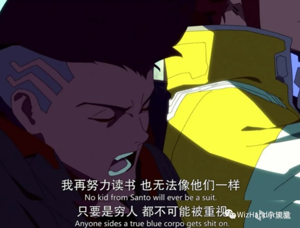 在剧情上,《边缘行者》给到了足够的冲突点,能够让观众明显的感知到大卫一行人所代表的的底层人——赛博朋克和荒板与军用科技——高科技公司、社会上流之间极大的落差感。