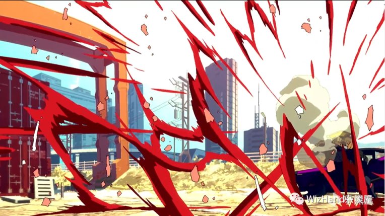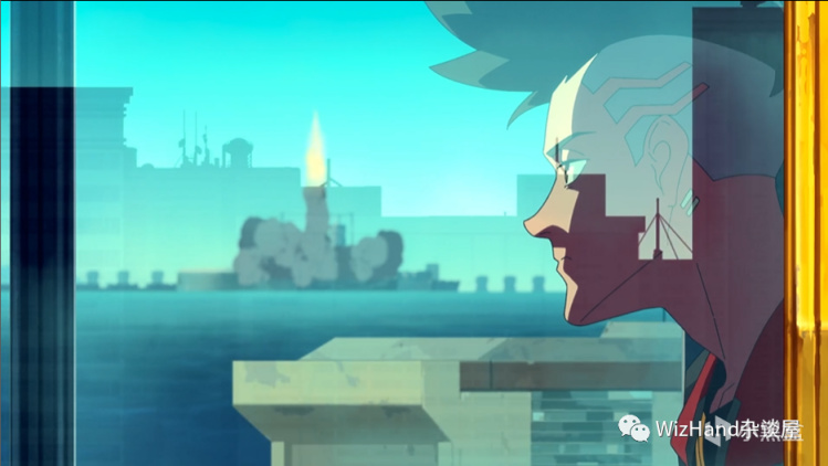 而全片最不可或缺的元素之一——人工义体(也叫做植入体)也是突出赛博朋克元素的主要载体,扳机社对于这方面的处理还是较为上心的,在抓住义体特点的同时也不乏运用简洁的大色块进行特效处理与补充。在战斗场面还是一如既往地充斥着满满的扳机风,和同社作品《普罗米亚》有这异曲同工之妙。大量卡通化的场景虽然让让部分细节缺失,但是这样做能够较好地切合住高密度的叙事。