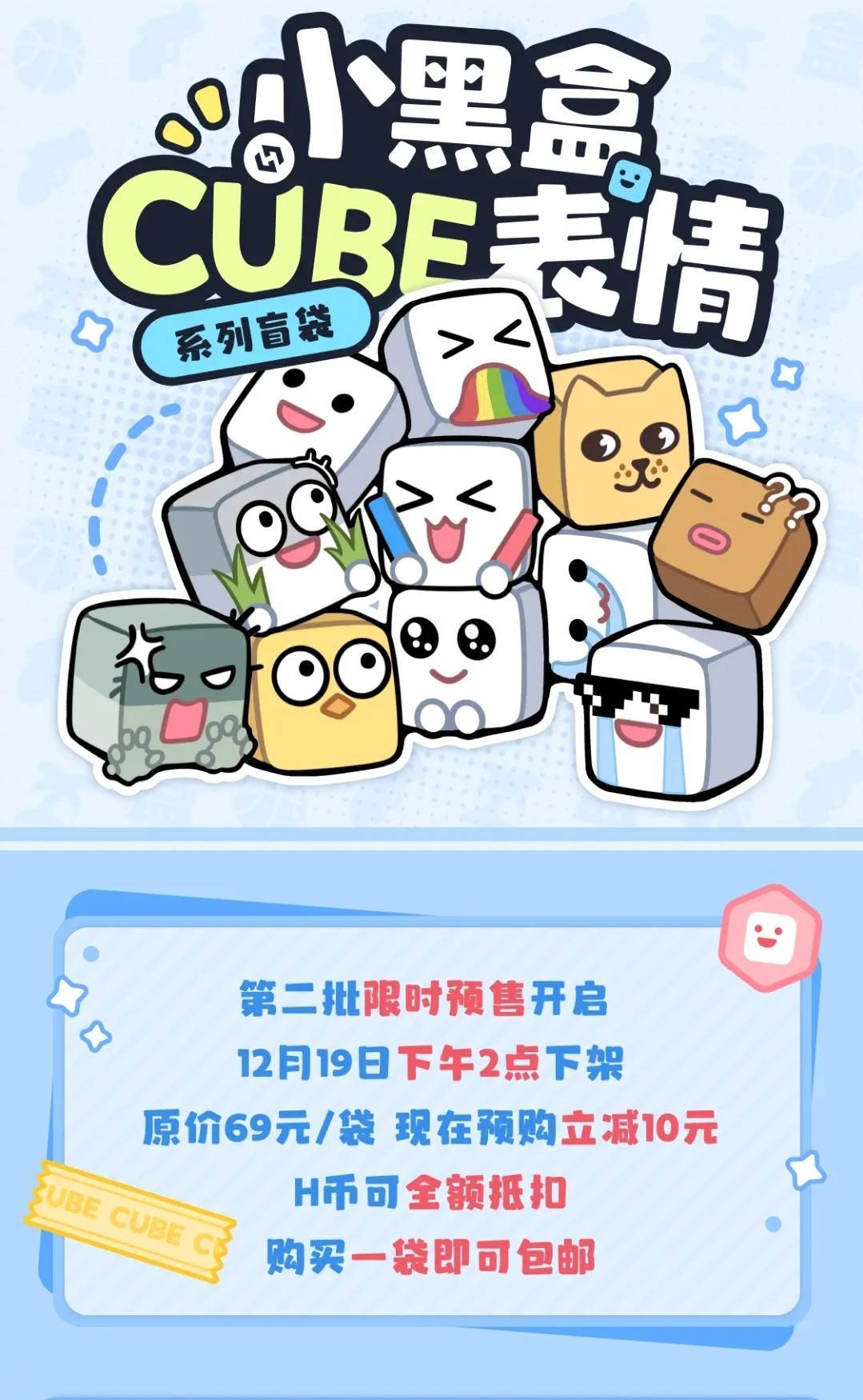本次的CUBE表情盲袋采用限时预售的形式,将于12月19日下午2点下架黑盒商城,现在预购立减10元,H币全额抵扣,一袋即可包邮!点击下方链接👇或者首页广告即可跳转预售活动页面!