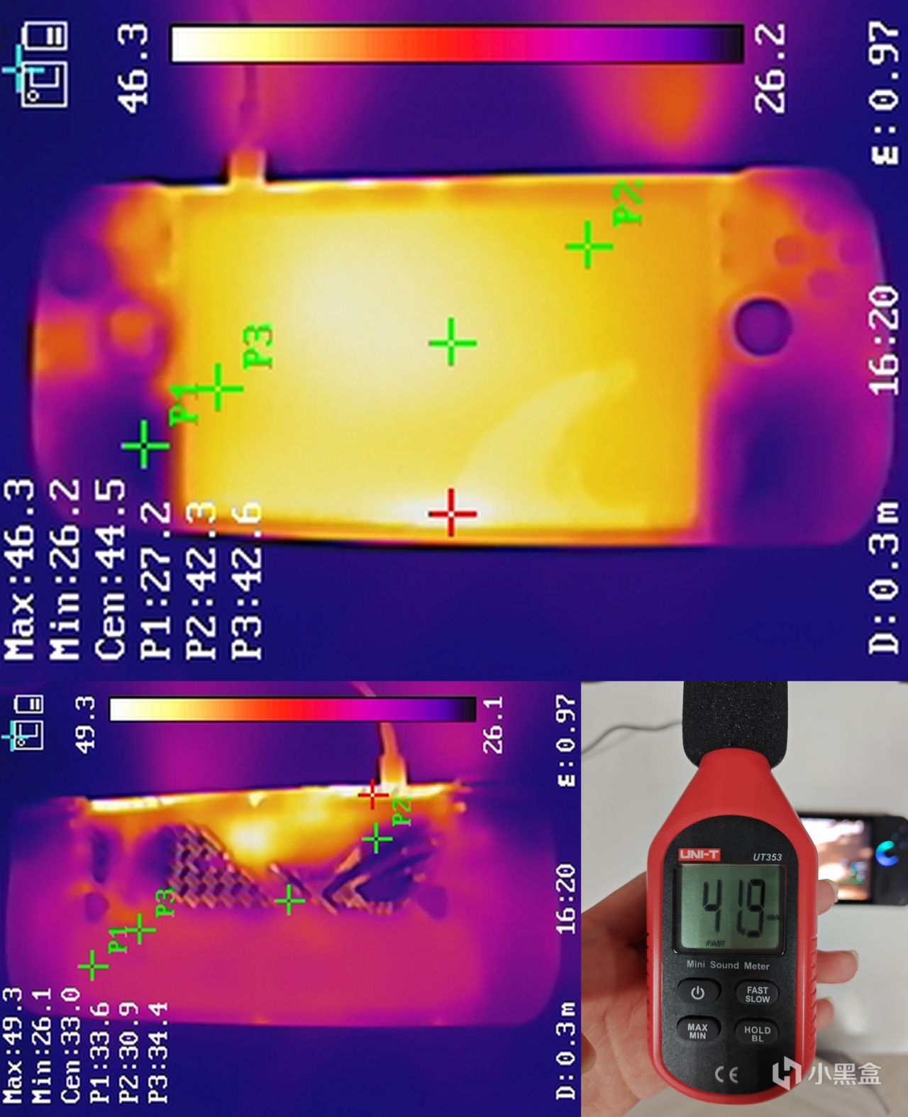 首先是性能拉满的情况下——插电、增强模式,表面温度如下,最热初位于屏幕中心下方,为46度,屏幕处为44度,都没有手机玩游戏热。屏幕旁手握的掌托以及背部才30度左右,几乎完全感觉不到热感,此时噪音为41.9分贝,只有一点点声音。