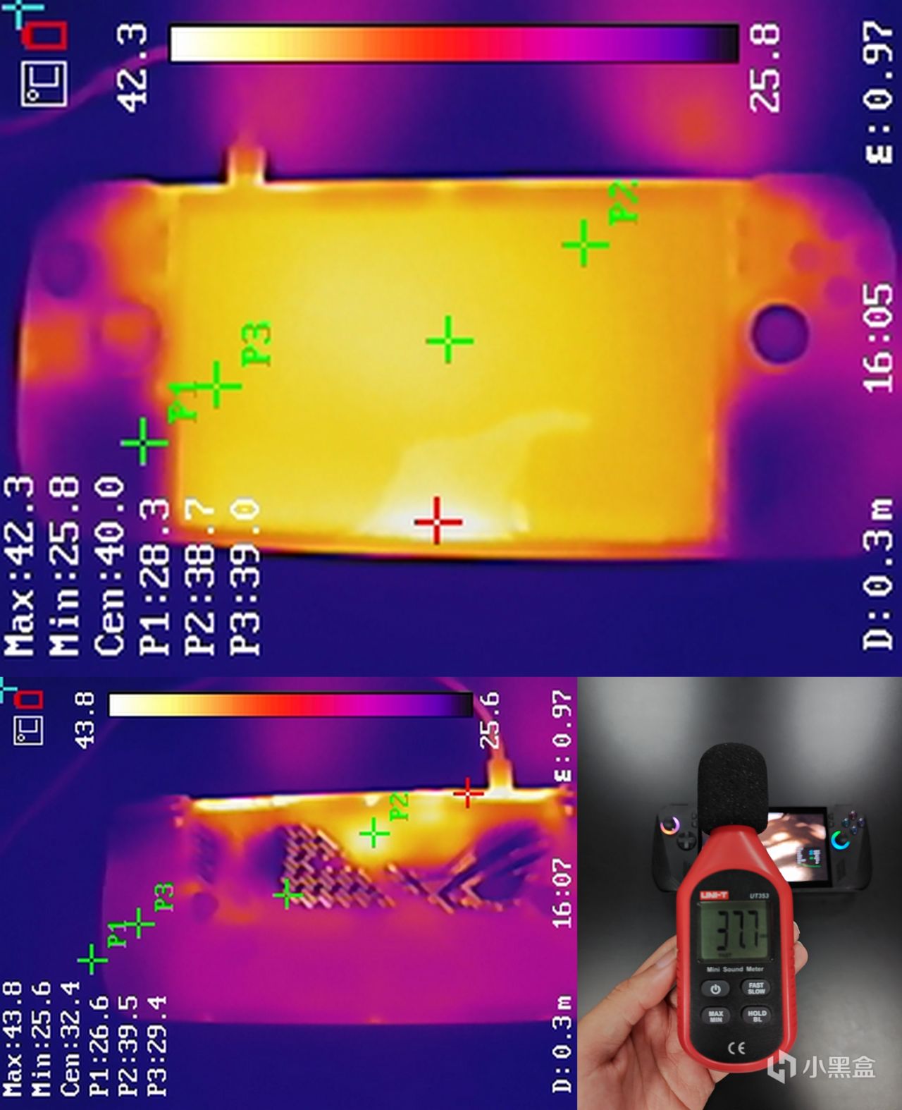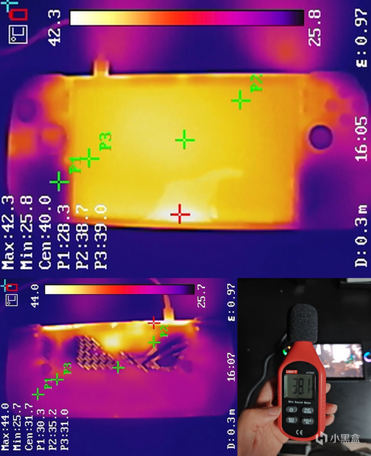 离电开启增强模式,正面最高为42度,屏幕为40度左右,此时噪音为37.7分贝。这就非常接近环境噪音了,几乎听不到风扇声。