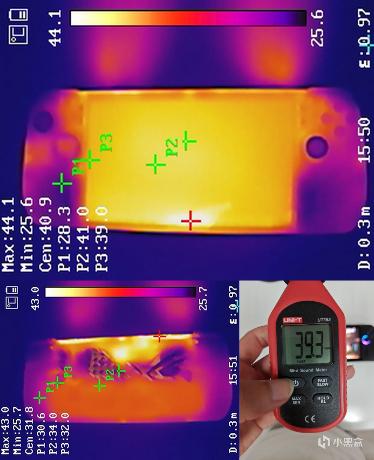 离电开启增强模式,正面最高为44度,屏幕为41度左右,此时噪音为39.3分贝
