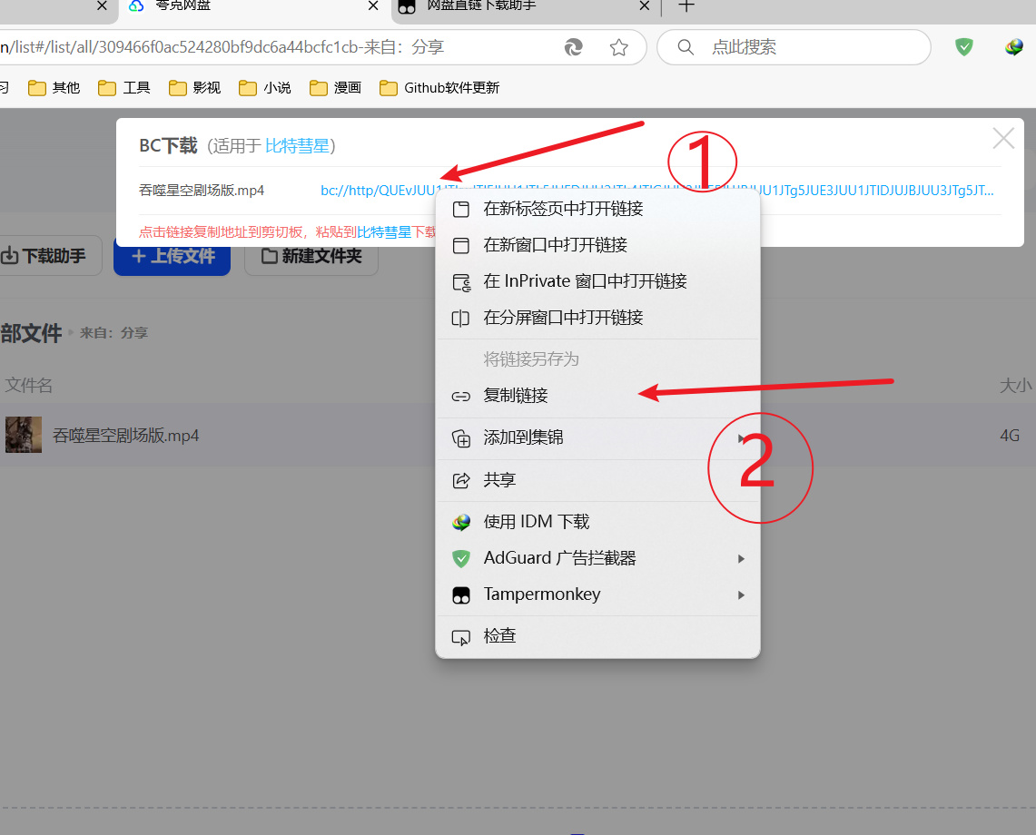 2.打开网页版夸克网盘,勾选一个文件,点击上面的下载助手,选择BC下载,之后鼠标右键复制蓝色链接