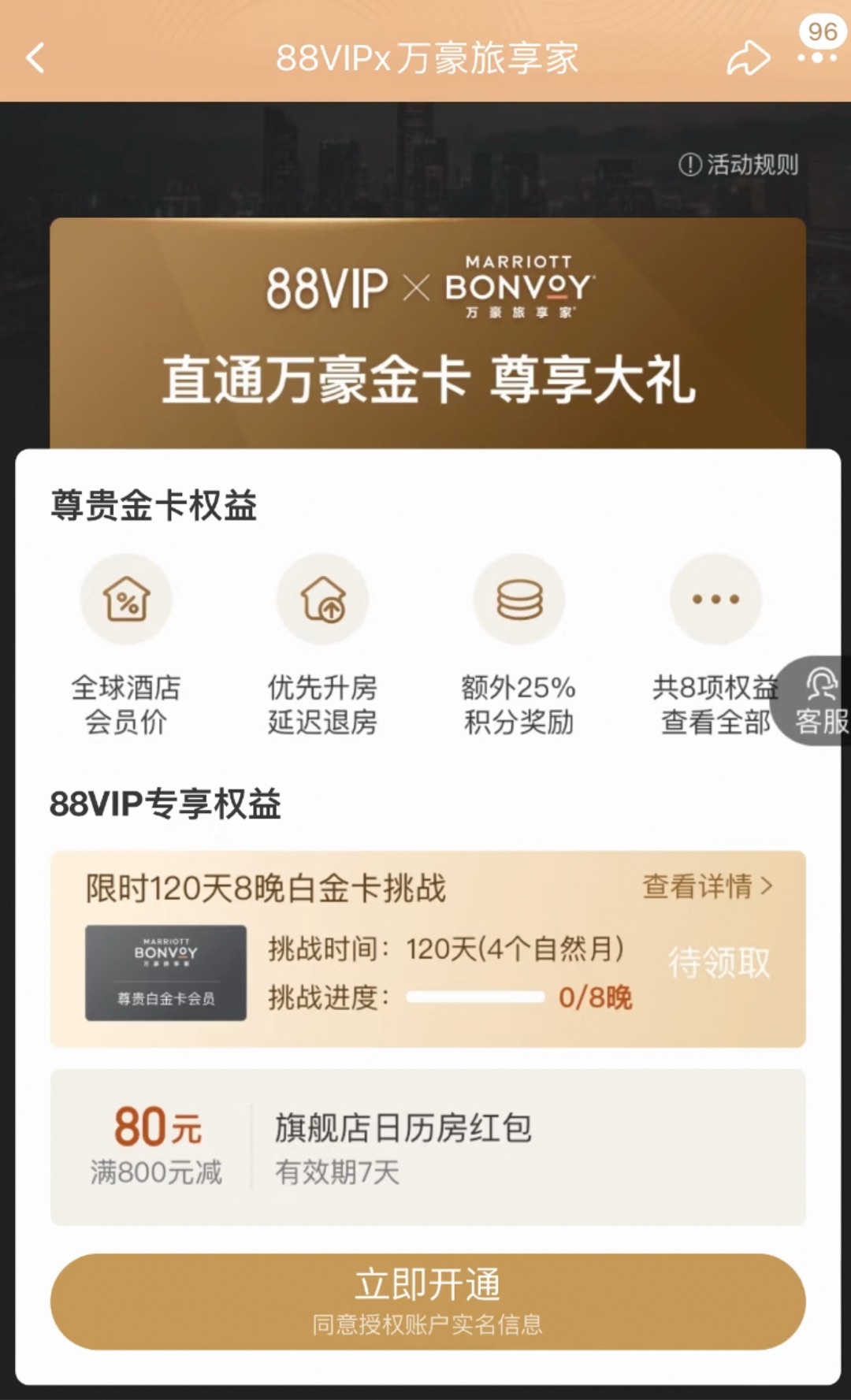 如果你是支付寶88會員,那麼恭喜你你可以在支付寶——88vip——會員權益內,直接獲得120天的8晚白金卡挑戰,在此期間你將以金會員的身份,住滿八晚後直接獲得白金會員!