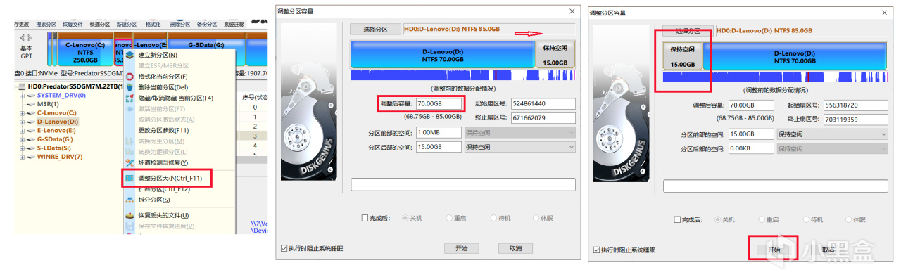 選中,點擊右鍵,點擊 “調整分區大小”,然後根據自己D盤剩餘的空間容量,手動修改 “調整後容量” 的數值,比如我這個 D 盤有 85G,只用了68.75G,那就可以改成70G,從而騰挪出 15G 的空間。