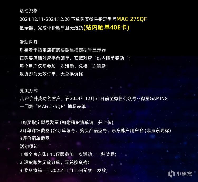 另外目前活动期间,站内晒单可以获得40元京东E卡,算上国补,实际到手价638.3元,冲就对了!!!售后方面,微星MAG 275QF还有三年免费上门、以换代修服务,品质有保障,需要27英寸高刷显示器的朋友可以重点关注下。
