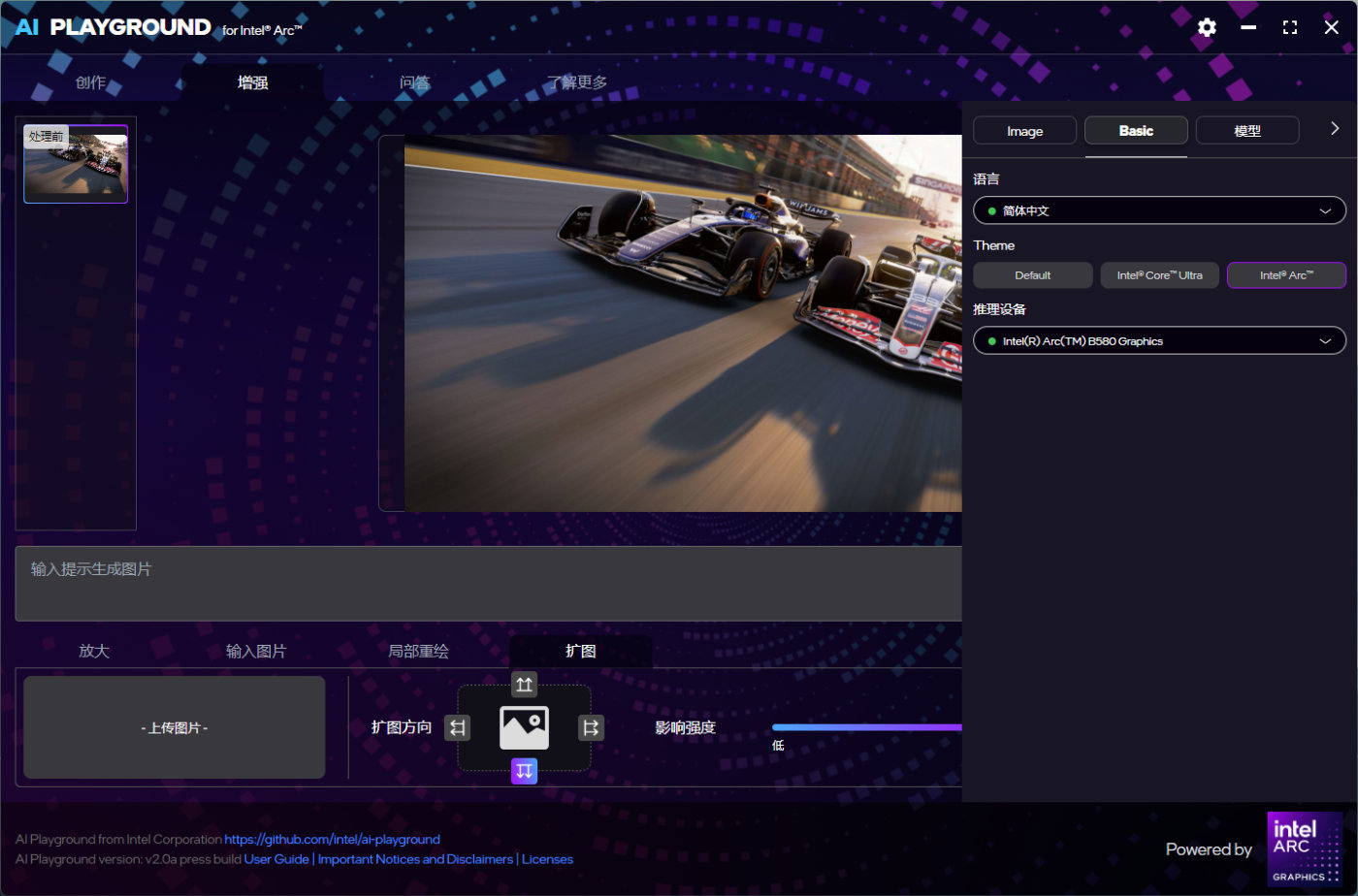 有意思的是,Intel也不满足依靠第三方开源软件,针对英特尔Arc B系列特性,还专门制作了一个专门版本的Al Playground 2.0 alpha for Intel Arc版本,软件本身不仅自带了对Stable Diffusion 1.5和Stable Diffusion SDXL支持,同时也提供图像增强,图像优化功能,甚至可以利用本地大语言模型进行本地聊天,AI翻译,本地文件总结等功能。目前已经提供了酷睿Ultra和Intel Arc的支持。