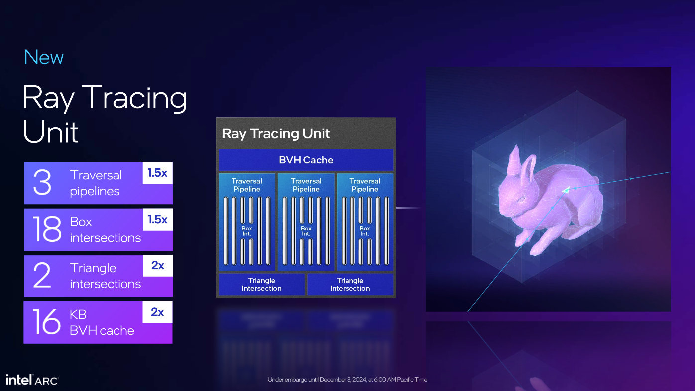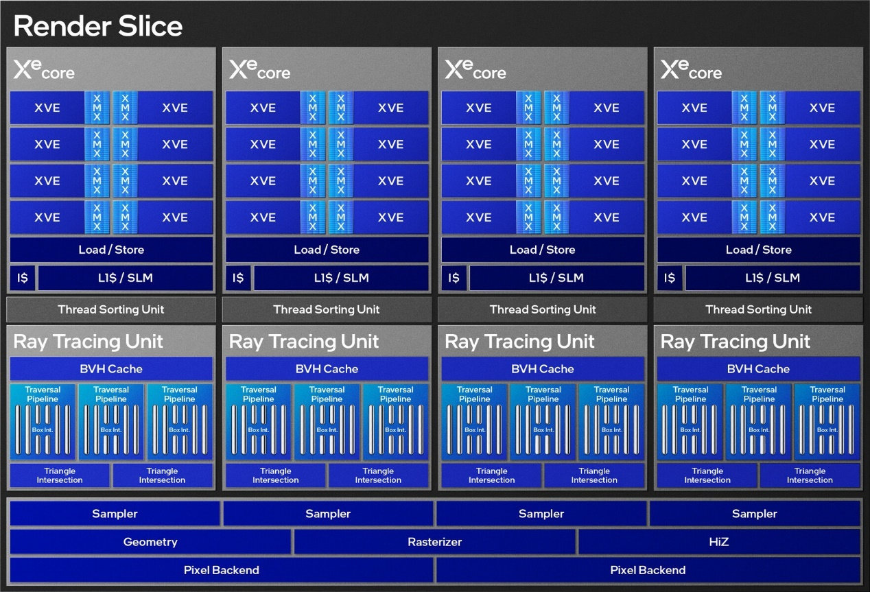 Xe RTU光线追踪单元也进行了拓宽,提供三条遍历通道,18 x Box intersections和2 x Triangle intersections计算,能够更快速地进行盒子和三角形之间的交叉检测。其中Box intersections是指单元在光线与盒子或者说包围体积相交时所能处理的数量,Triangle intersection指代光线与三角形相交时所能处理的数量。