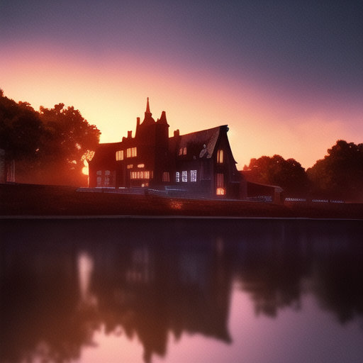 beautiful render of a Tudor style house near the water at sunset, fantasy forest. photorealistic, cinematic composition, cinematic high detail, ultra realistic, cinematic lighting, Depth of Field, hyper-detailed, beautifully color-coded, 8k, many details, chiaroscuro lighting, ++dreamlike, vignette