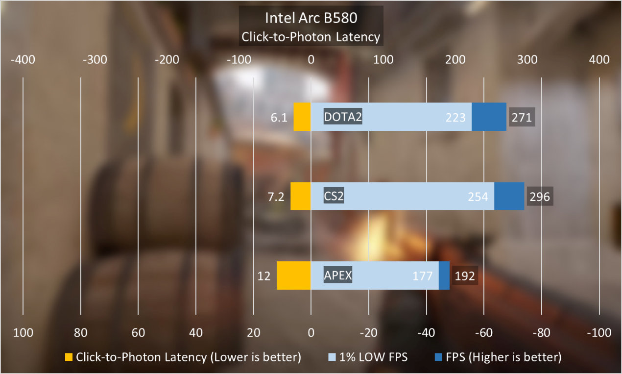 即使不依靠XeSS,Intel Arc B580 Limited Edition对于注重竞技类的在线游戏也已经有很好的表现,这里我们尝试了《DOTA2》、《反恐精英2》和《APEX》,不管是1% LOW FPS还是延迟表现,这块GPU已经表现得足够好。