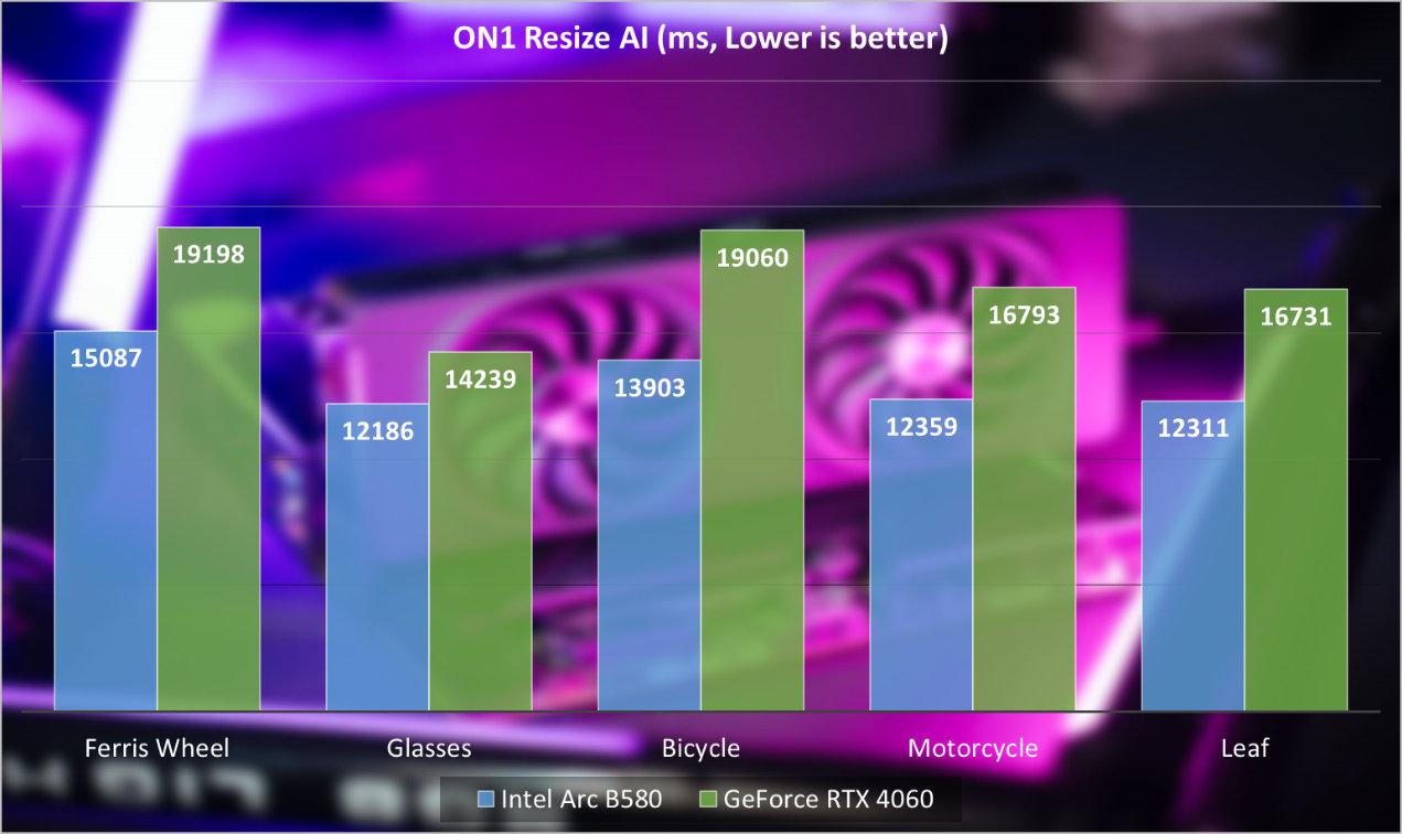 实际测试中,同样五张照片,Intel Arc B580相对GeForce RTX 4060可以节省27%到37%的时间。