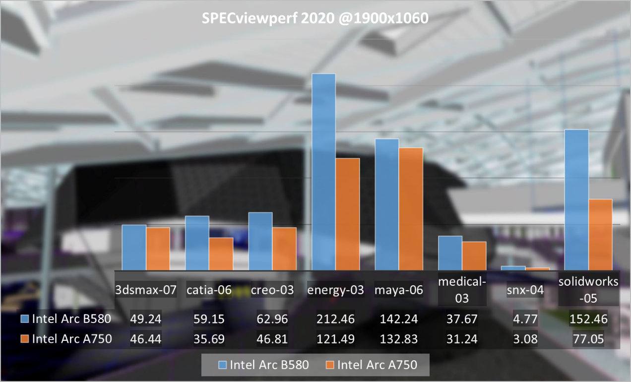最后渲染和专业软件检测,我们也引入了Blender Benchmark和SPECview 2020作为参考,Intel Arc B580相对于A750也有了不同幅度的进步,而且我们相信随着驱动版本的不断升级,Intel Arc B580也可以越做越好。