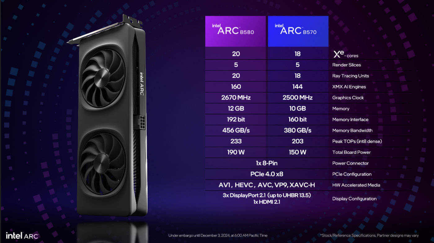 在月初的媒体沟通会上,英特尔表明Intel Arc B系列先发的两款型号为Intel Arc B580和Arc B570两款,其中Intel Arc B580先发,Arc B570则会安排到2025年1月份。