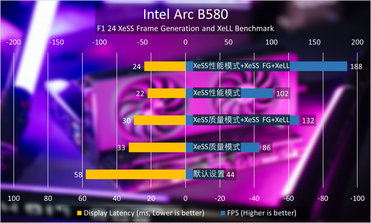 这里我们分别对默认设置,XeSS性能模式+XeSS FG,XeSS质量模式+FG一共五种模式进行尝试,可以看到XeSS FG配合XeLL,可以给XeSS带来更高帧率的同时,也能降低显示响应,帧率最高可以提升3.2倍,显示延迟降低1.6倍,效果是非常出众。
