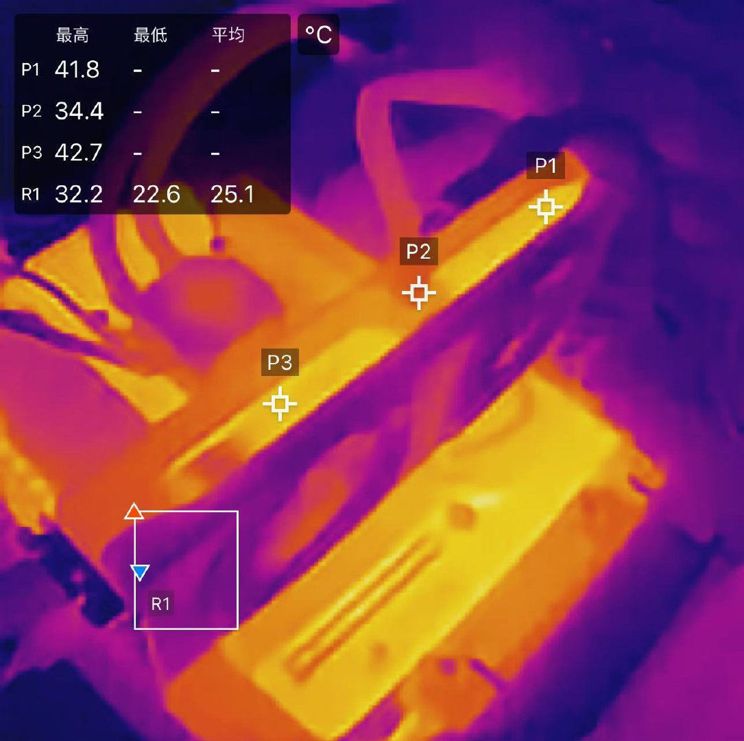 在实际显卡压力测试中,GPU核心温度为60℃左右,通过红外线测温20℃室温内可以看到出风口温度最高在42℃左右,供电接口部分温度在34℃左右,长期压力状态使用不会对电源接口造成影响,显卡整体表面温度保持相当冷静的状态,因此也适合装入到一些小型化机箱内。