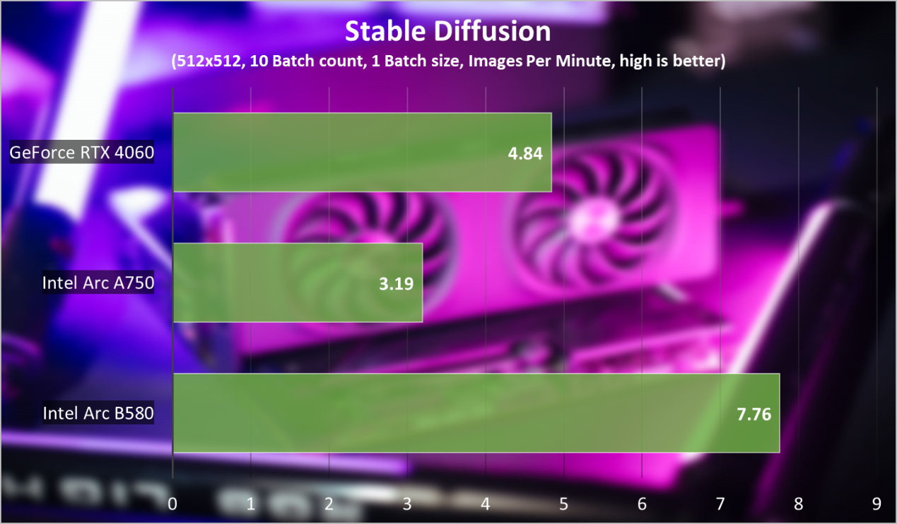 除了游戏,显卡的创造力也已经成为衡量的另一项指标,特别是随着AI应用的不断普及,GPU对AI的加速表现相当值得关注,Intel Arc B580 Limited Edition同样如此。这里我们先用Stable Diffusion作为参考。