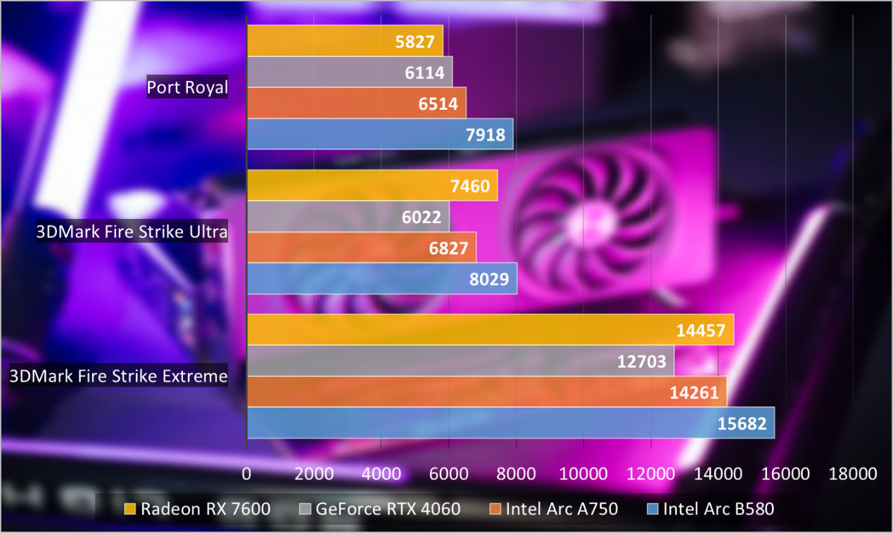 在3DMark基准进行测试环节,主要使用了3DMark Time Spy,3DMark Time Spy Extreme,3DMark Fire Strike Extreme,3DMark Fire Strike Ultra,Port Royal。这里直接引入NVIDIA GeForce RTX 4060,Intel Arc A750和AMD Radeon RX 7600进行比较。