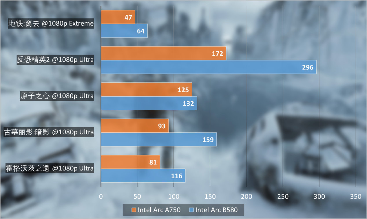 在1080p分辨率下,我们将画质调到最高。用Intel Arc A750和Intel Arc B580进行对比,比较中可以发现,Intel Arc B580 Limited Edition相对Arc A750提升在10%到70%之间,平均提升36%,是一个相当明显的进步。